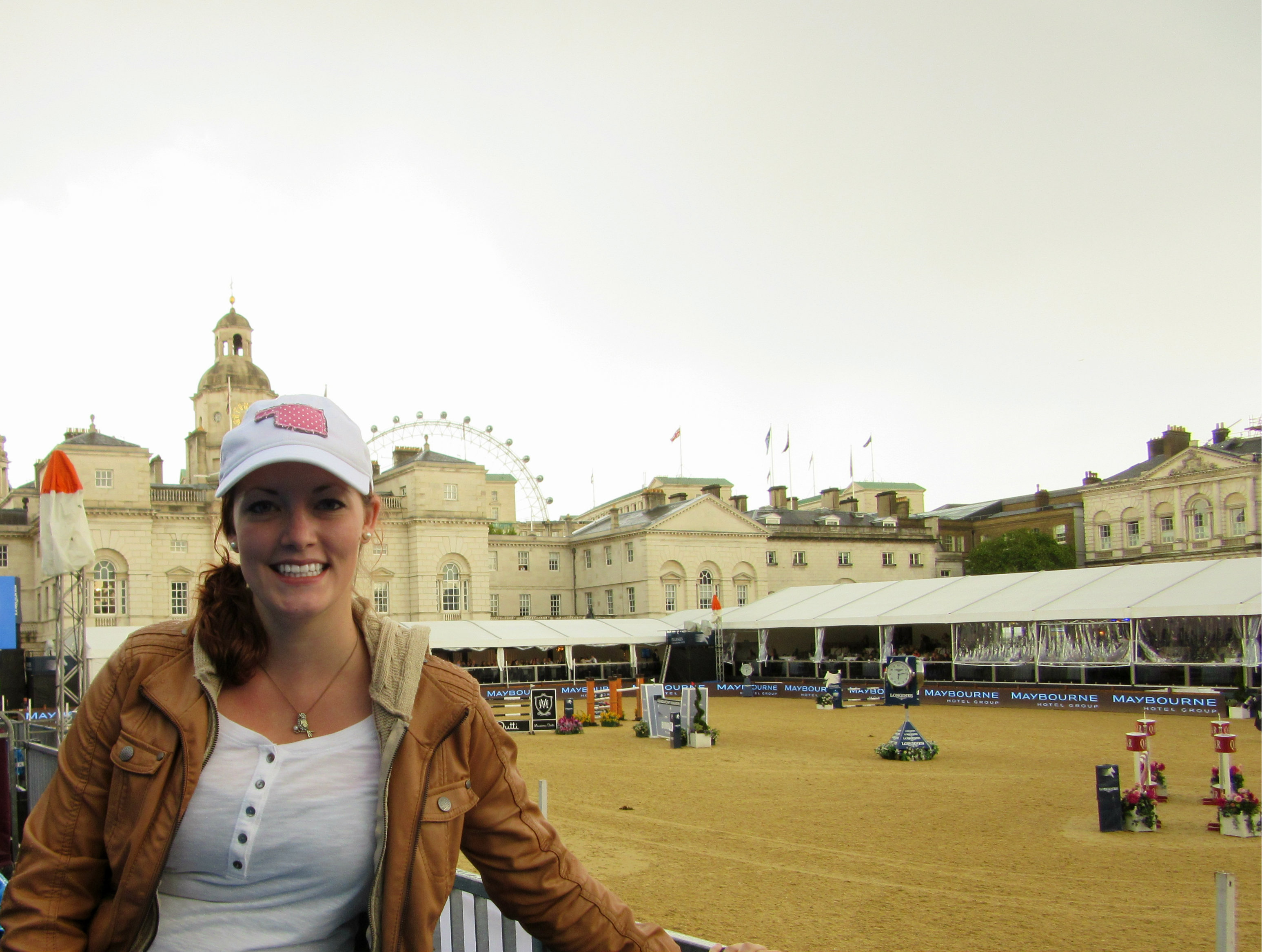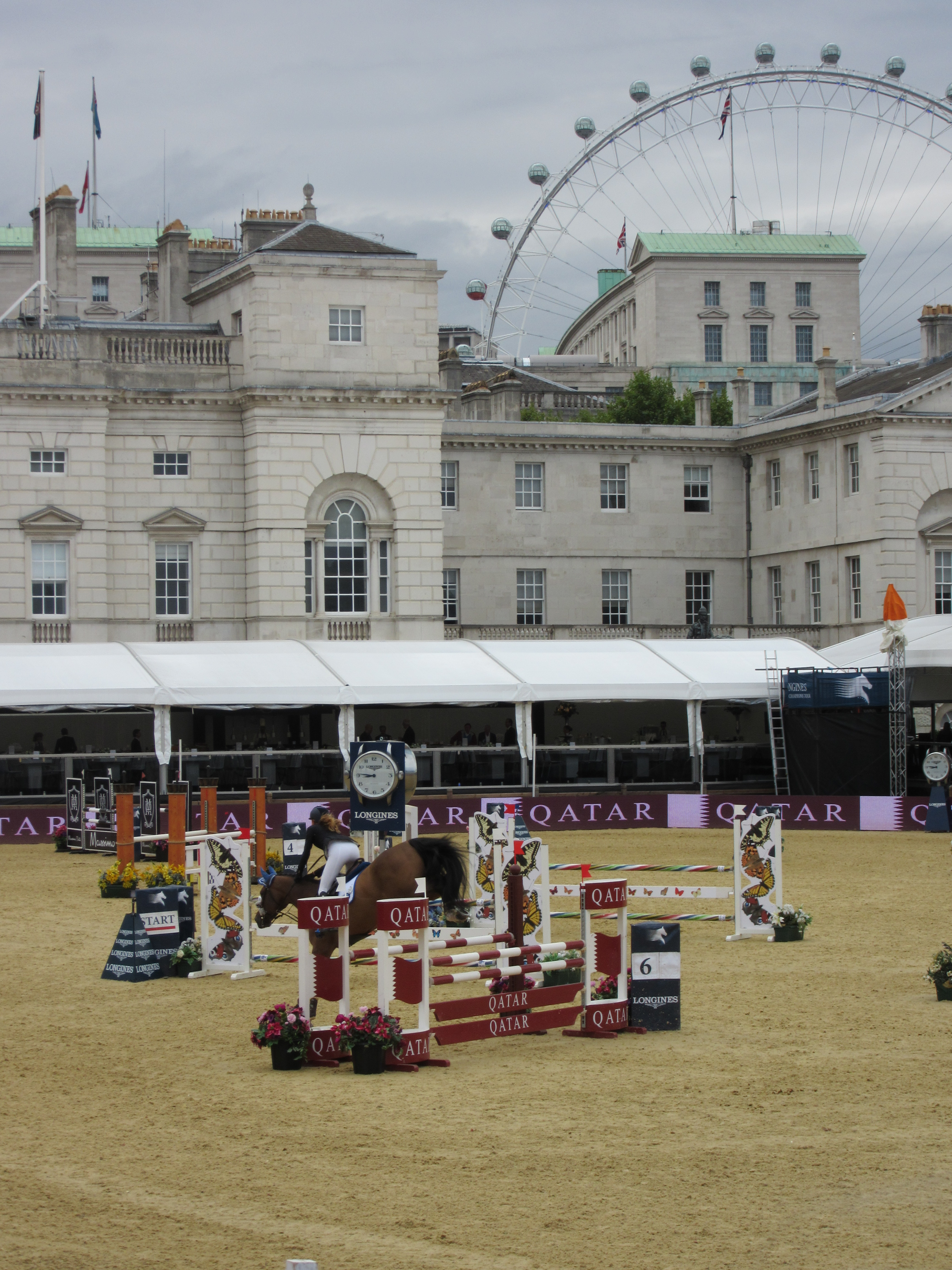 The weather was actually quite nice at the start, and the classes started at a relatively low height with riders I had never heard of. (One of the USA riders was named Tara Couch – the coincidence made me laugh.) It was all held at the Horseguards Parade in Westminster – where Henry VIII used to have jousting tournaments… and there I was watching one of the largest global showjumping competitions. The arena also had the gorgeous backdrop of the surrounding Westminster buildings and a view of the top of the London Eye.