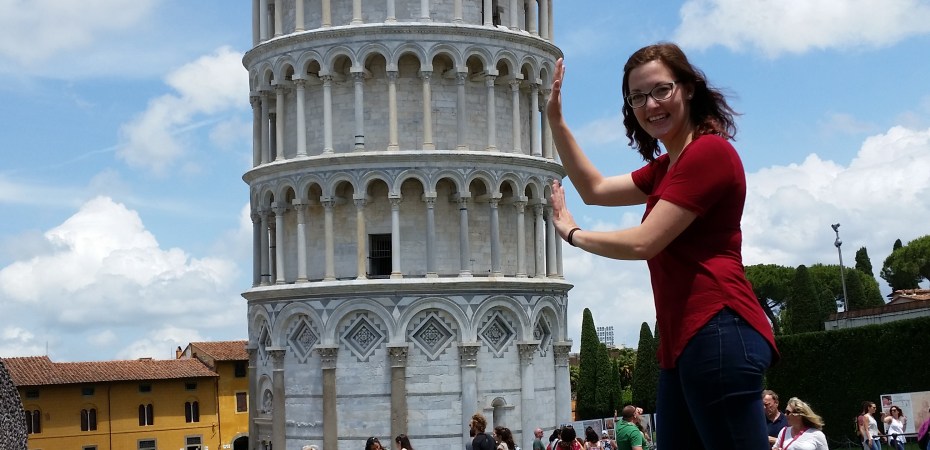 It was noticeably hotter than London (of course), so our 15-minute walk in the sun from the train station was a bit sweaty. But it was pretty much a straight shot down a long street and over a bridge. I was glad to stretch my legs after being on the plane. And once we made it through the swarm of people, we had 20 or 30 minutes to admire il Torre di Pisa.